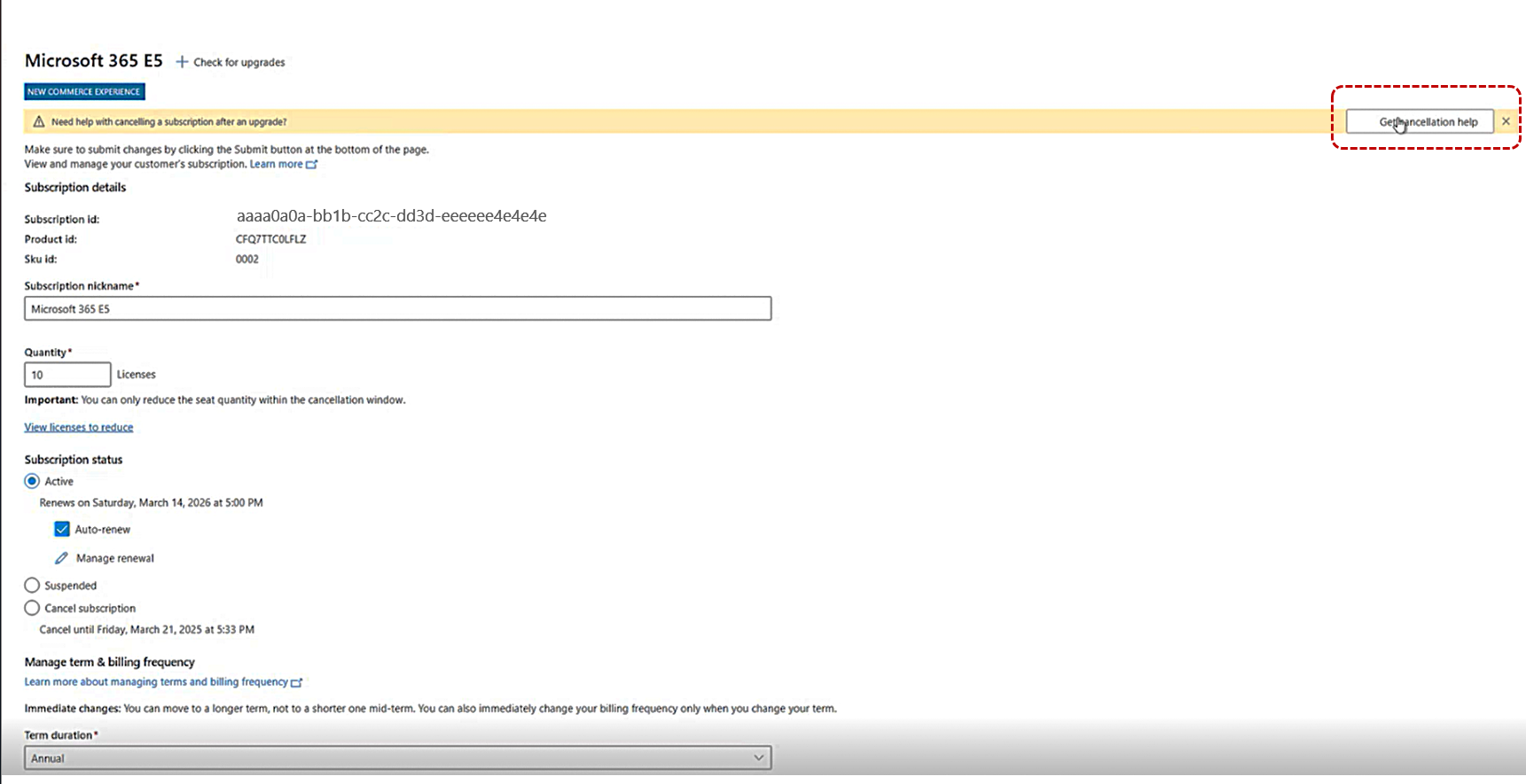 To begin, confirm that the subscription for your customer is upgraded through Partner Center using the upgrade workflow. If you purchase a new higher-level subscription as a separate transaction rather than processing it as an upgrade to an existing subscription, the existing subscriptions aren't eligible for cancellation or license count reduction through the AI assistant.