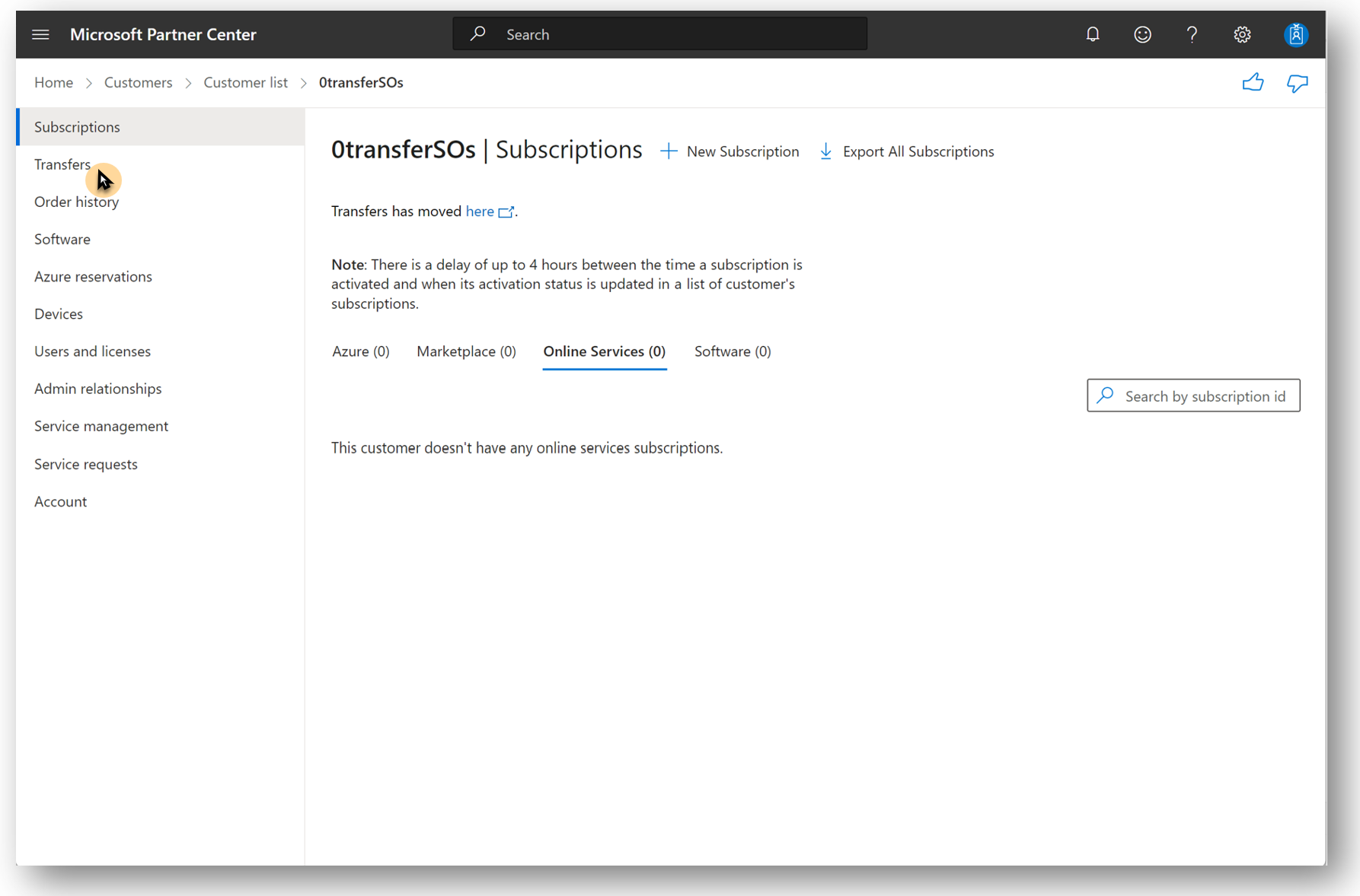 Transfer requests enable the source partner to define which subscriptions are transferred to the target partner. The target partner should be in close contact with their customer and the source partner to ensure the transfers include the intended subscriptions from the source partner.