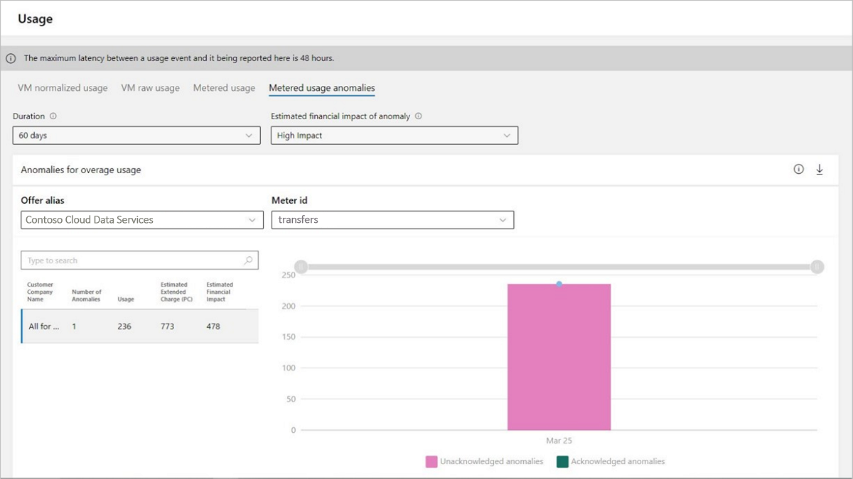 To help ensure that your customers are billed correctly, use the Anomaly detection feature for both SaaS Apps and Azure application managed application plans. This feature monitors usage against metered billing and predicts the expected value of usage within the expected range. If the usage is outside the expected range, it's treated as unexpected (an anomaly), and you'll receive an alert notification on your Offer Overview page in Microsoft Marketplace in Partner Center. You can track your customers’ usage daily for every custom meter dimension that you’ve set.