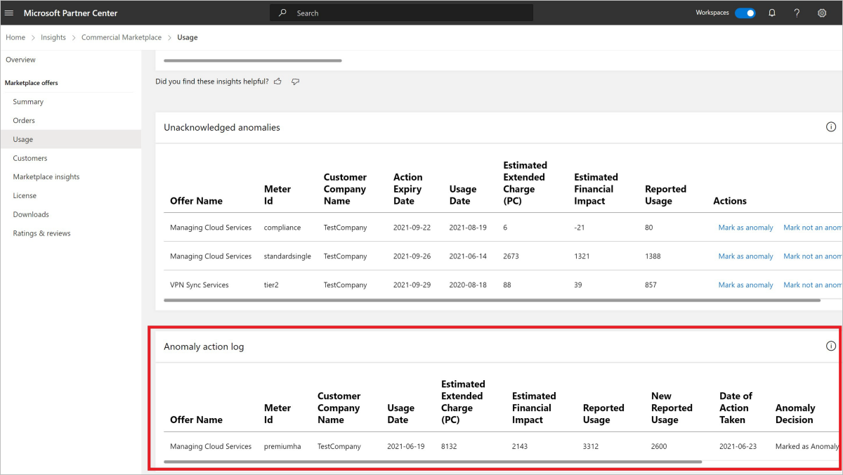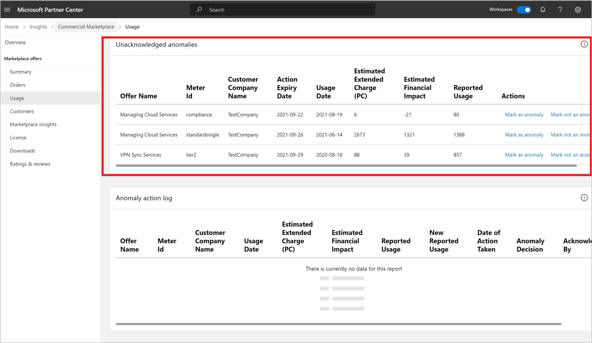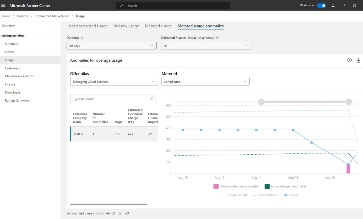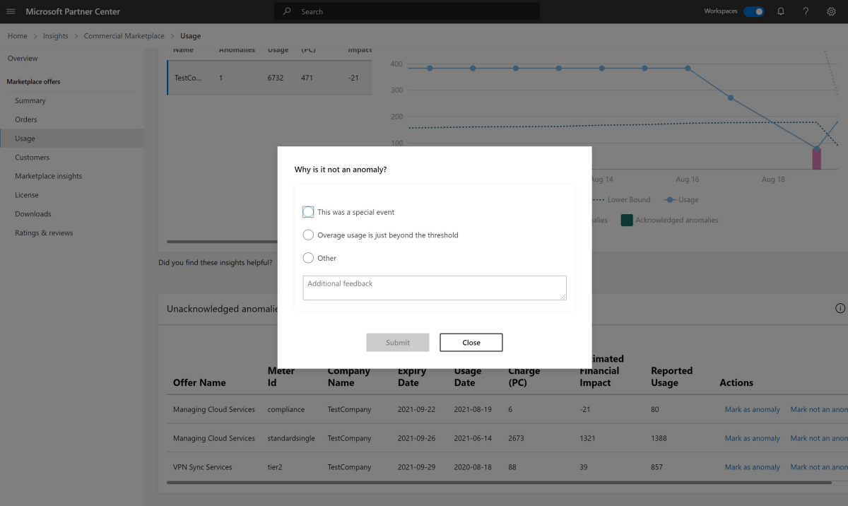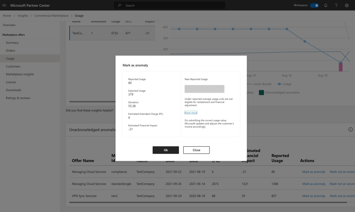 Partner Center analytics won't support restatement of overage usage events in the export reports. Partner Center lets you enter the corrected overage usage for an anomaly and the details are passed on to the correct Microsoft team for investigation. Based on the investigation, Microsoft will issue credit refunds to the overcharged customer, as appropriate. When you select any of the flagged anomalies, you can select Mark as anomaly to mark the usage overage anomaly as genuine.