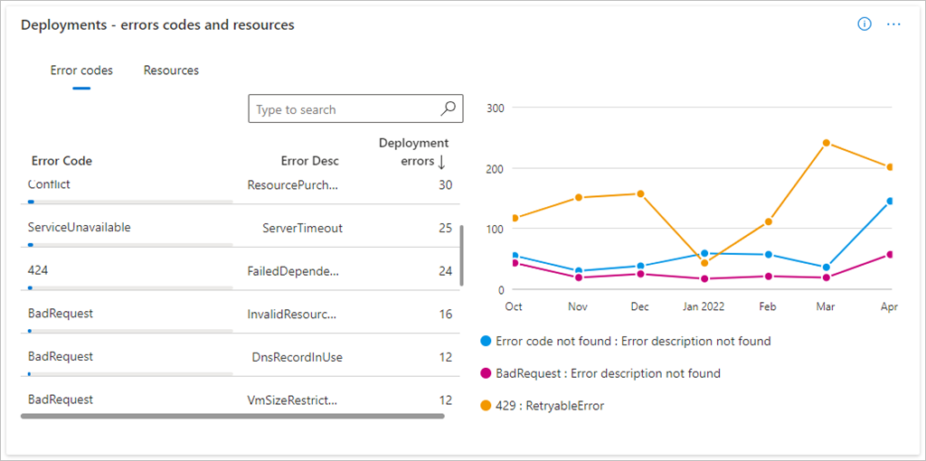 - Sort error codes and resources for deployment failures by basis error count in the table.