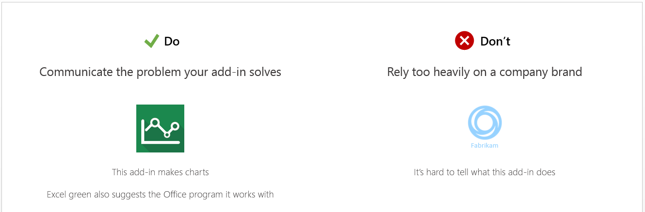 Your name and description can be powerful tools to draw in potential customers. You also want to present a unified visual identity for your solution. The logo you use is important. Two files represent your logo. To present a consistent logo, both images should be of the same logo or icon. This way, the user sees the same logo in Microsoft Marketplace and when the solution is displayed in Office or SharePoint. The two images have different formatting requirements.