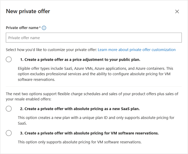- 1. Create a private offer as a price adjustment to your public plan: Use this option to create a multiparty private offer for eligible offer types including SaaS, Azure VM, Azure applications, and Azure containers. You can customize your partner pricing with either absolute pricing or percentage discounts. This option excludes professional services offer types and the ability to set absolute pricing for VM software reservations.