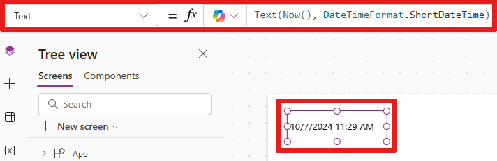 A formula includes one or more functions. The Now function returns the current date and time in your local time zone, and the Text function formats values such as dates, times, and currency.