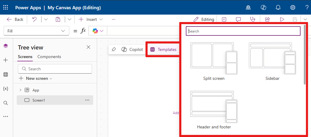 You can use inline actions to apply a layout to blank screens. For example, if you add a new blank screen to your app and hover over the canvas, you can select the inline action Templates and then select one of more than one dozen layouts.