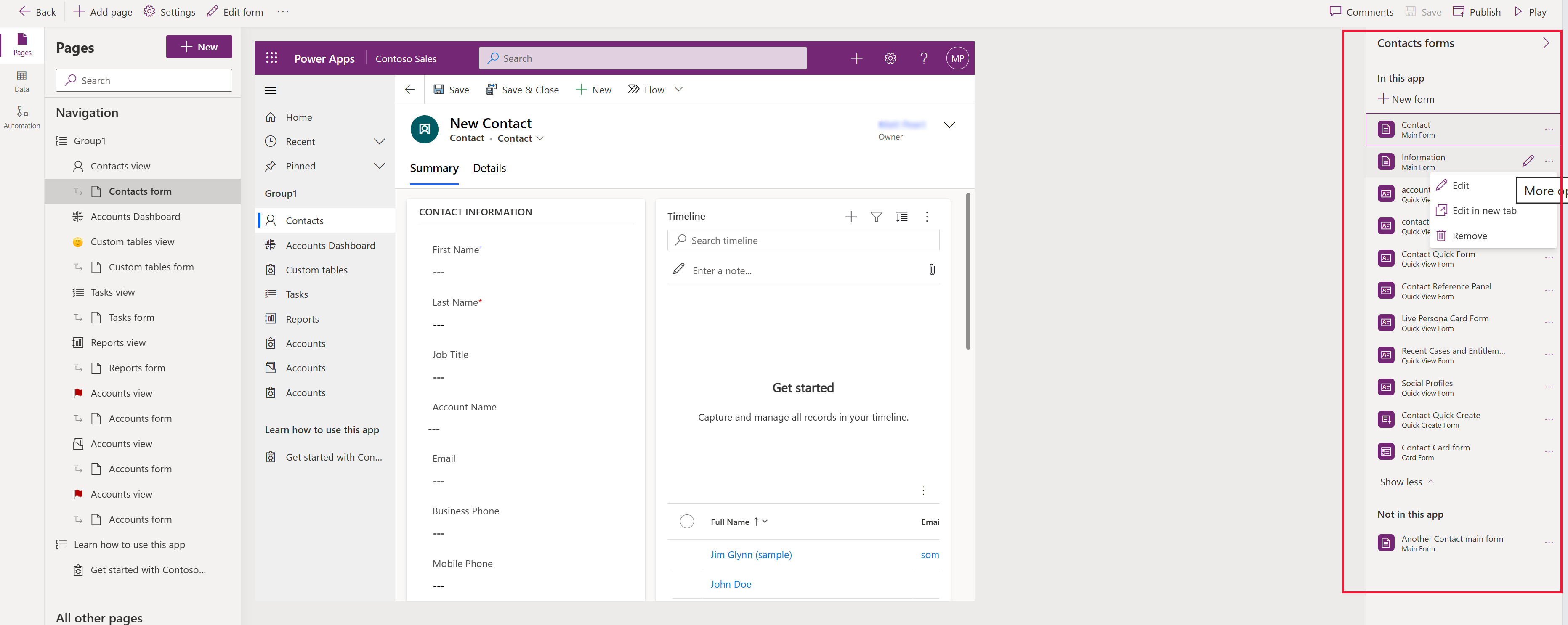 On the right forms pane, the list of available forms is displayed. Forms that are available in the app appear under In this app. Forms available to add but not displayed in the app appear under Not in this app. To remove a form that's displayed, select ... > Remove. To add a form that isn't displayed, select ... > Add.
