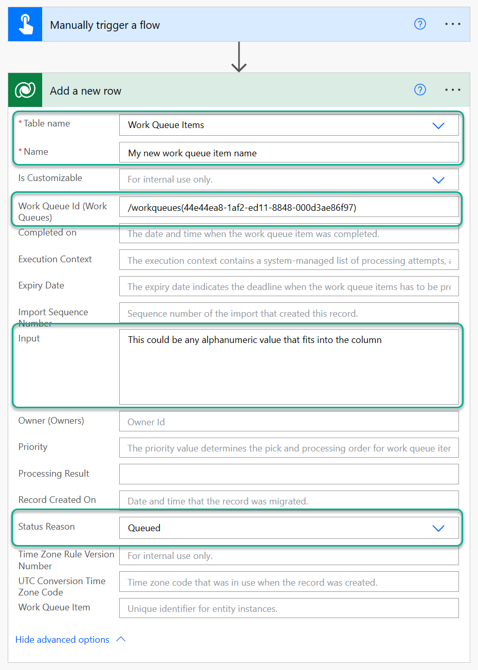 Using a cloud flow with the Dataverse connector action - Add a row new action to add one or more rows to the Work Queues and Work Queue Items tables.