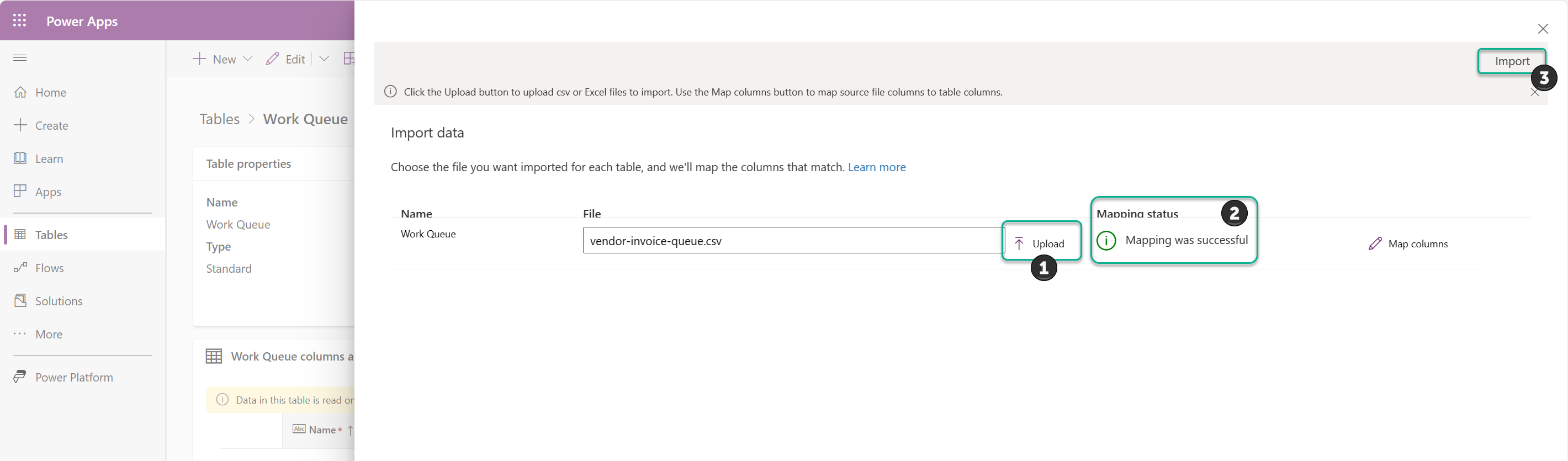 - Select Upload and choose the vendor-invoice-queue.csv file.