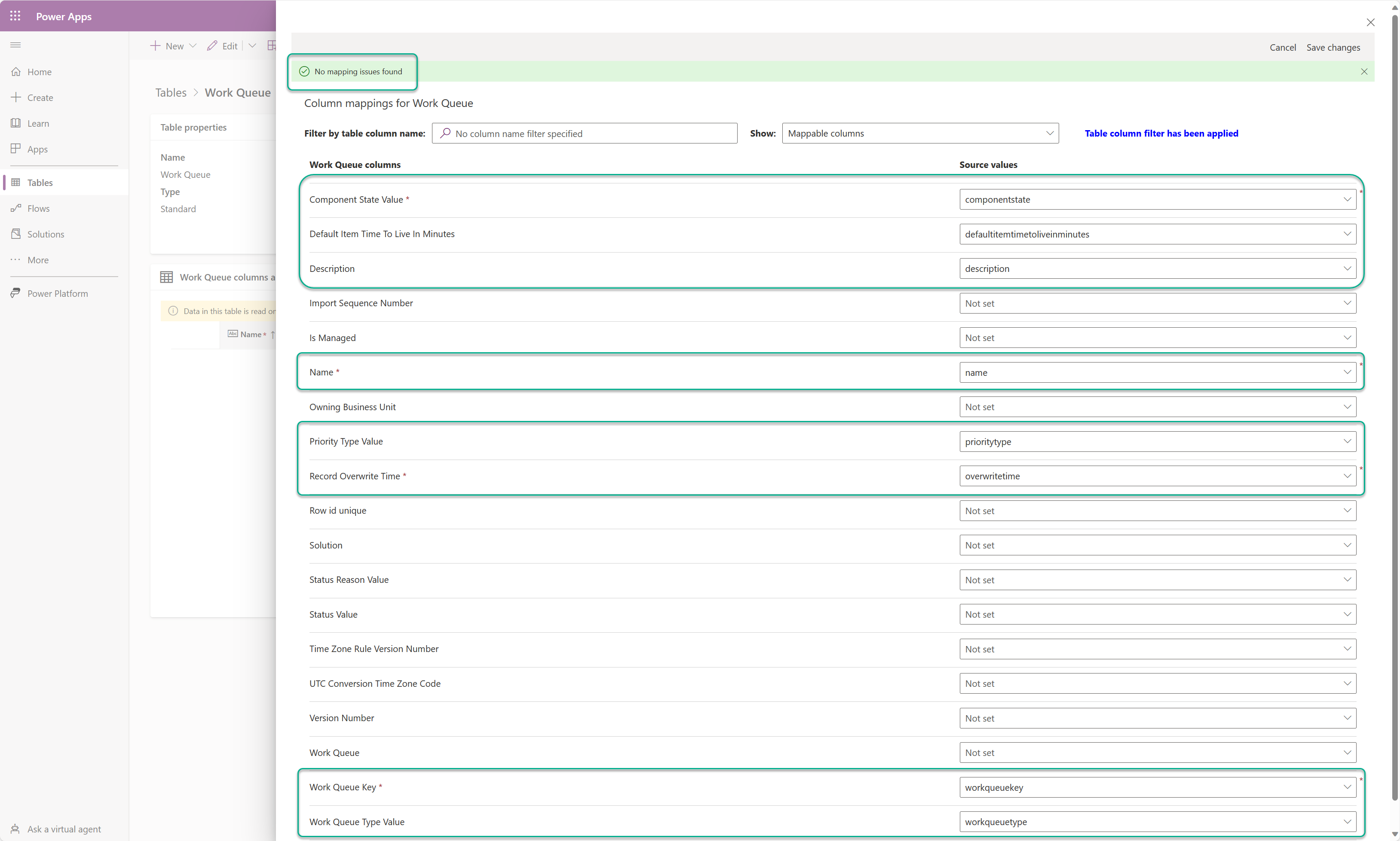 In the Column mapping section, under Primary key select workqueueitemid.