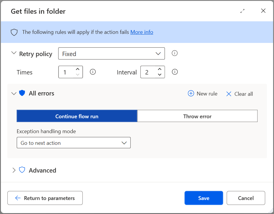 Retrieve the latest occurred error and use it in later actions with the Get last error action.