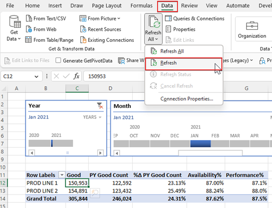 • Select the Data tab in Excel, select Refresh All > Refresh.