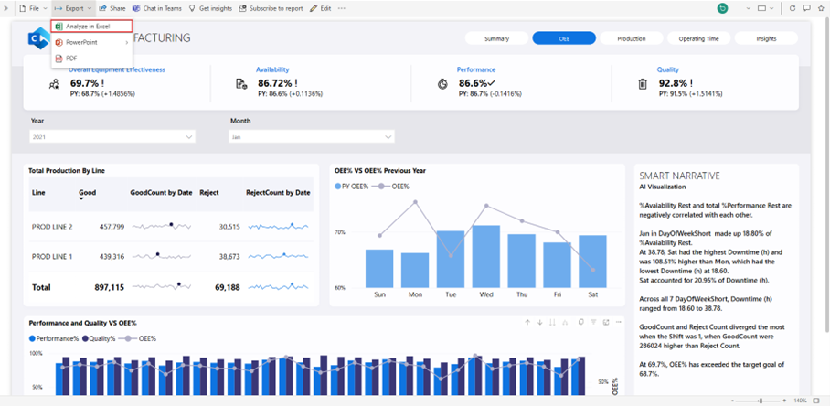 Open a Power BI report. Select Export > Analyze in Excel from the top ribbon.