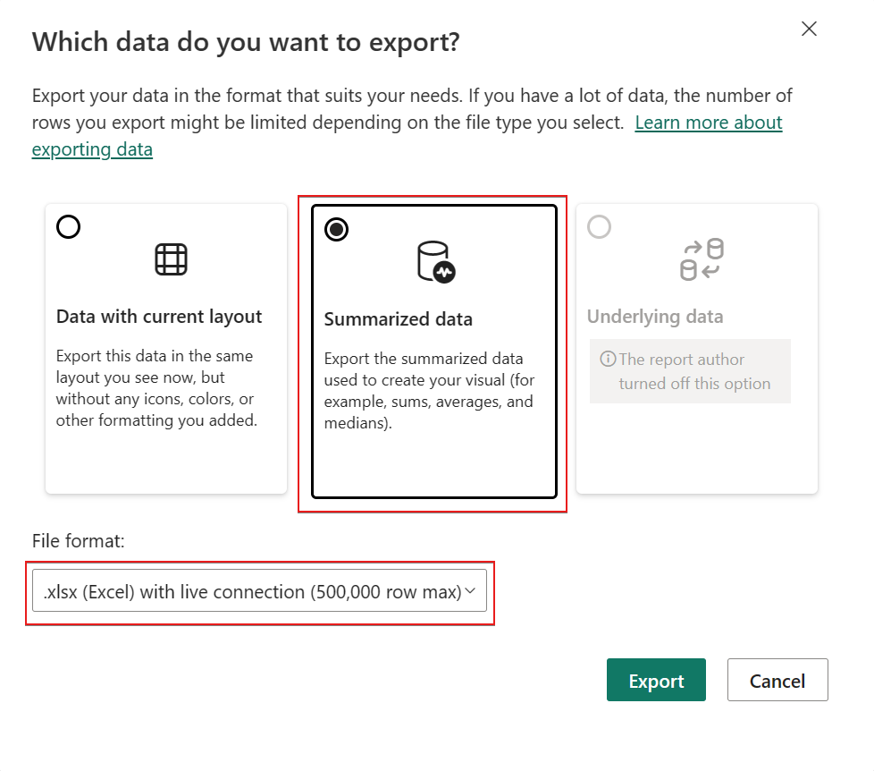 Select the Summarized data card, and choose the .xslx (Excel) with live connection (500,000 row max) option under File format.