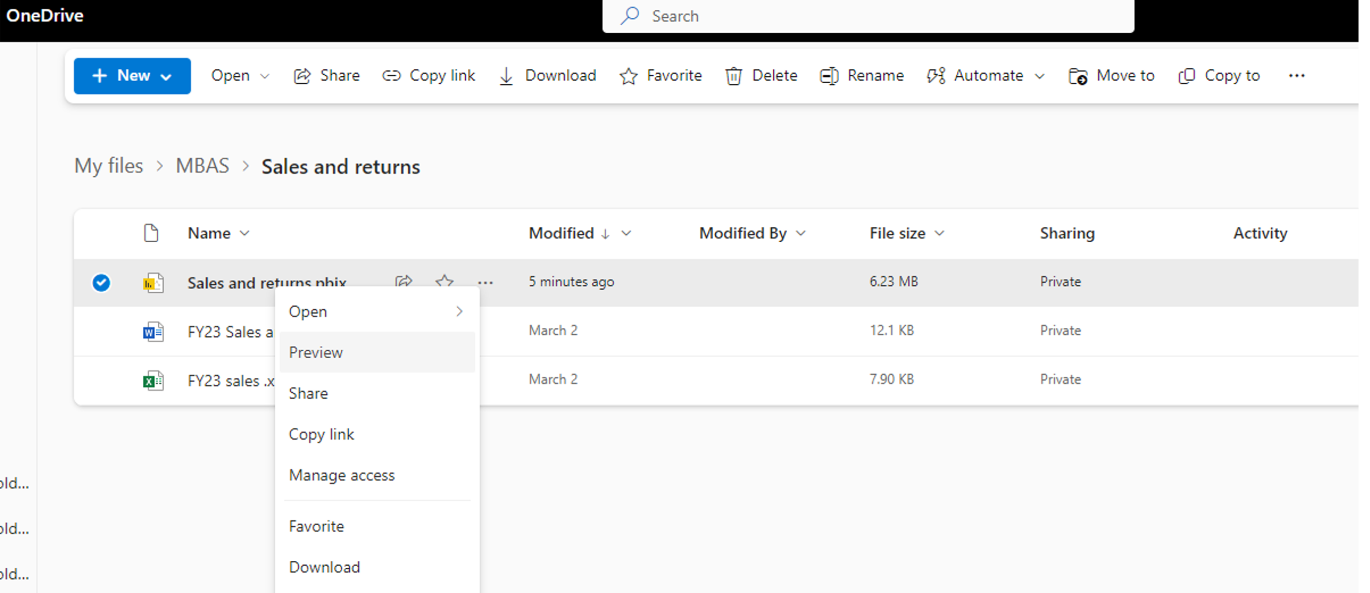 You can also open the file in preview mode by right-clicking the file or selecting More options (...) > Preview.