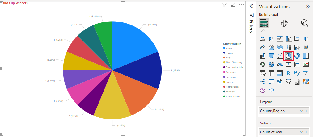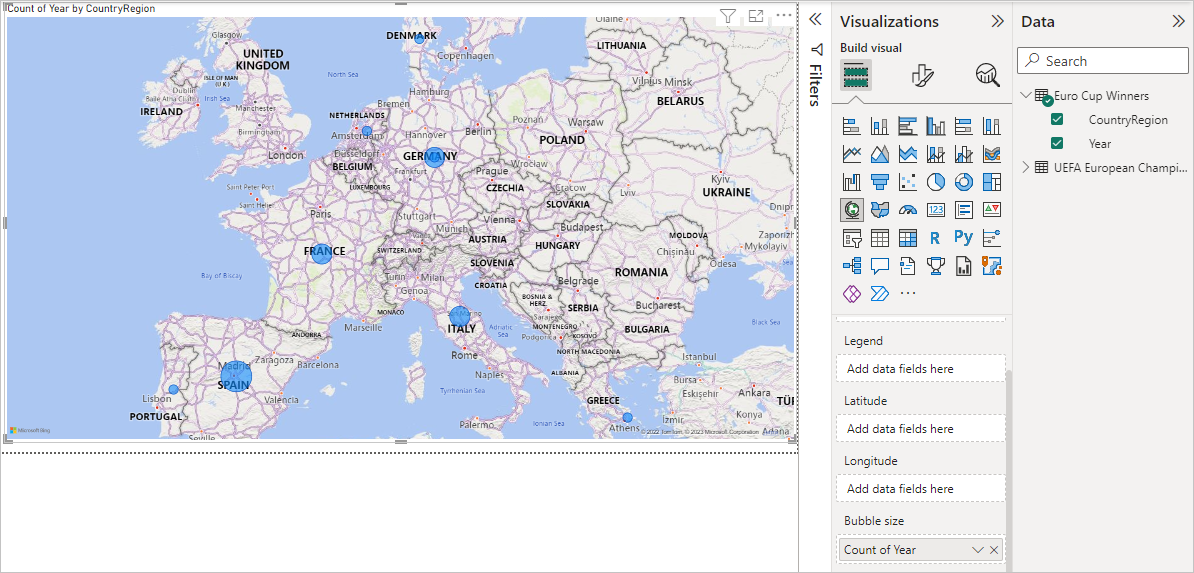 The map shows identical data points for every country/region that won a Euro Cup tournament. To make the size of each data point reflect how often the country/region has won, drag the Year field to Add data fields here under Bubble size in the lower part of the Visualizations pane. The field automatically changes to a Count of Year measure, and the map visualization now shows larger data points for countries/regions that have won more tournaments.
