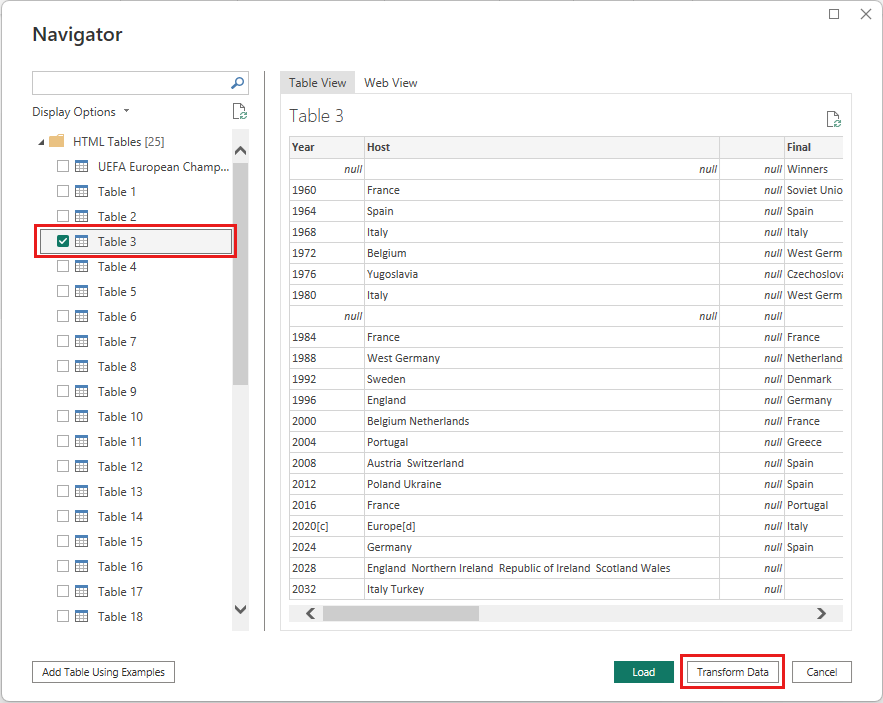 Select Table 3 in the Navigator list, and then select Transform Data.