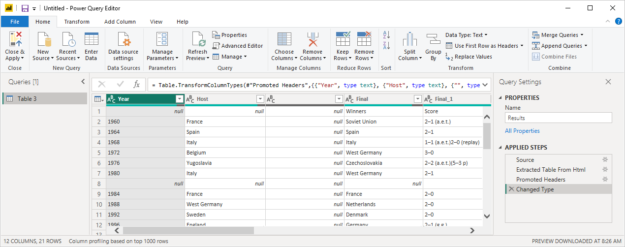 Now that you've shaped the data the way you want, you're ready to name your query "Euro Cup Winners" and import it into your report.