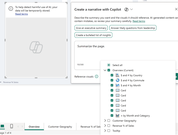 In Power BI Desktop and the Power BI service, you can use Copilot for Power BI to quickly create a narrative about a report with just a few clicks. This narrative can summarize the entire report, specific pages, or even specific visuals that you select. You can curate the tone and specificity of the narrative with suggested and custom prompts, making it extremely versitile.