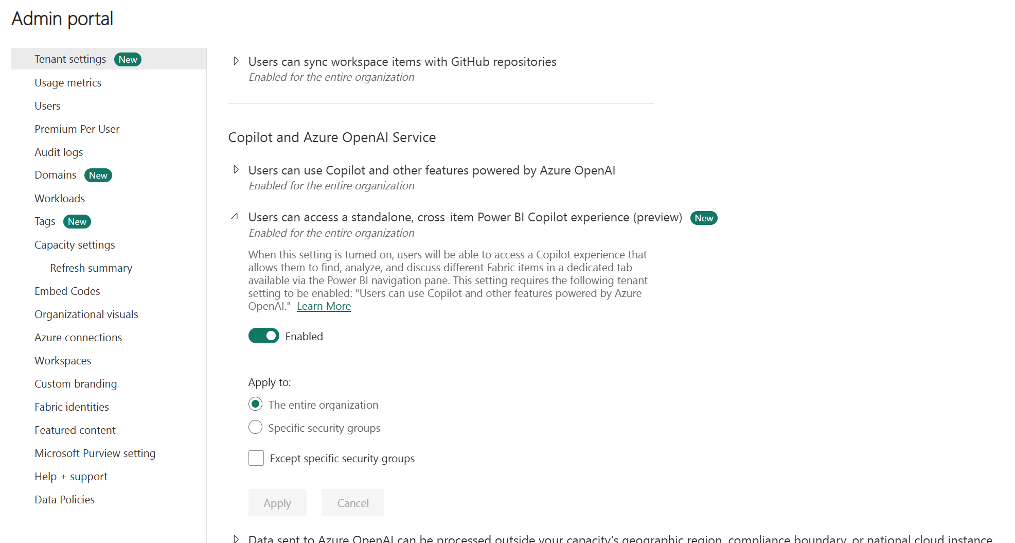 - The setting called Users can use Copilot and other features powered by Azure OpenAI must be enabled at the tenant level. It isn't sufficient to enable it at the capacity level (that is, if delegated).