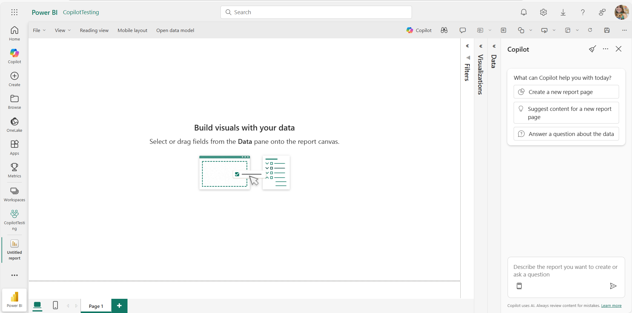 Copilot in Power BI is available as a standalone, full-screen experience that allows people to find and analyze any report, semantic model, and Fabric data agent they have access to. Unlike the Copilot pane, which only answers questions about the report you currently have open, the standalone Copilot finds and answers questions about any data you have access to. Learn more about the standalone Copilot.