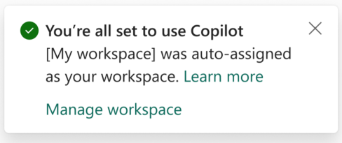 We automatically select a workspace from a partially randomized list of eligible workspaces, weighted toward workspaces with more available capacity. This approach helps balance usage and prevents overloading any single capacity. This selection persists across sessions as long as the workspace remains Copilot-enabled and has available capacity. If the workspace becomes disabled for Copilot or reaches its capacity limit, we automatically reassign a new one and notify the user. If an FCC becomes available, it always overrides the autoselected workspace. Users receive a dismissible notification showing the chosen workspace and a direct option to change it.