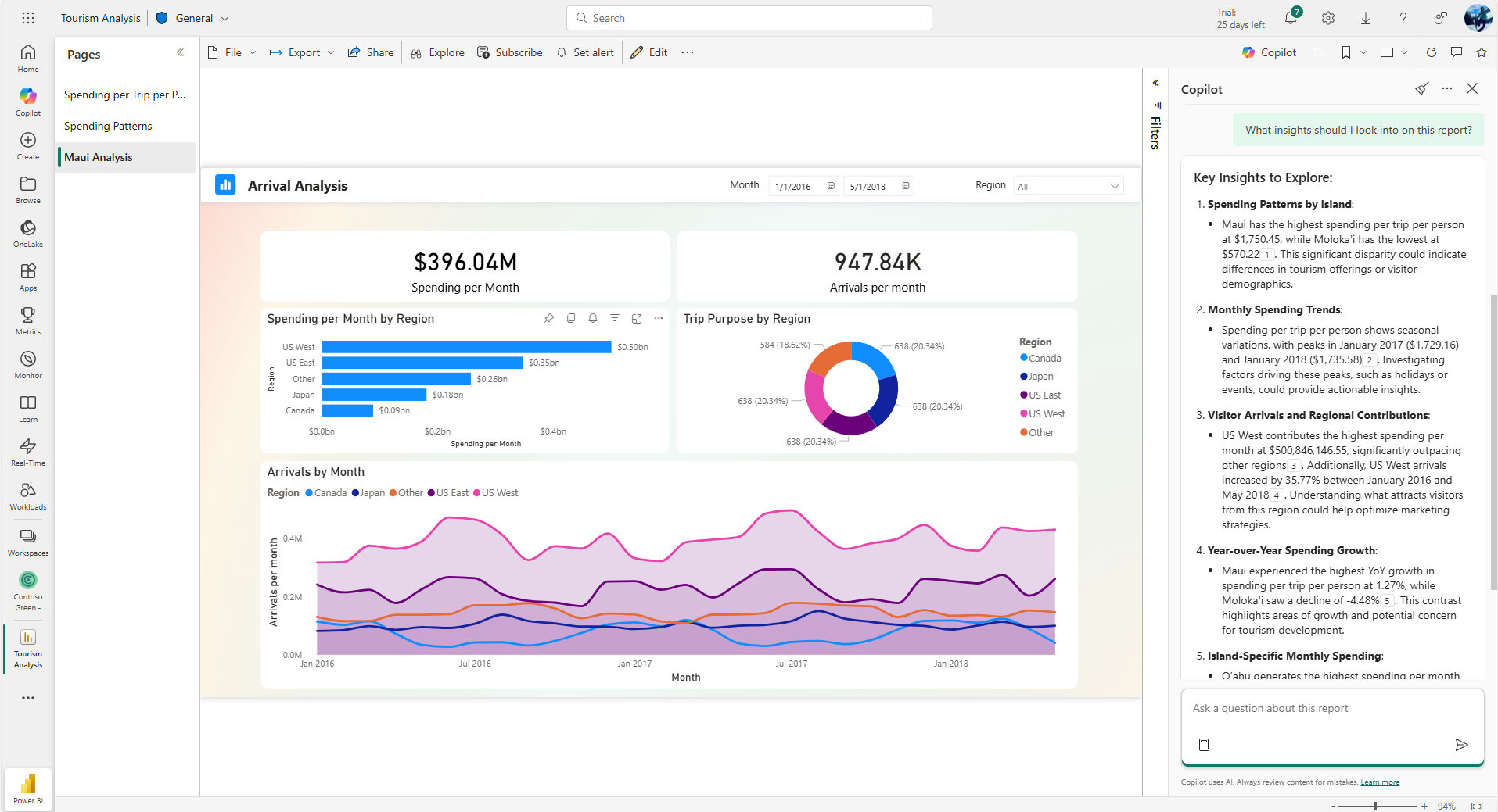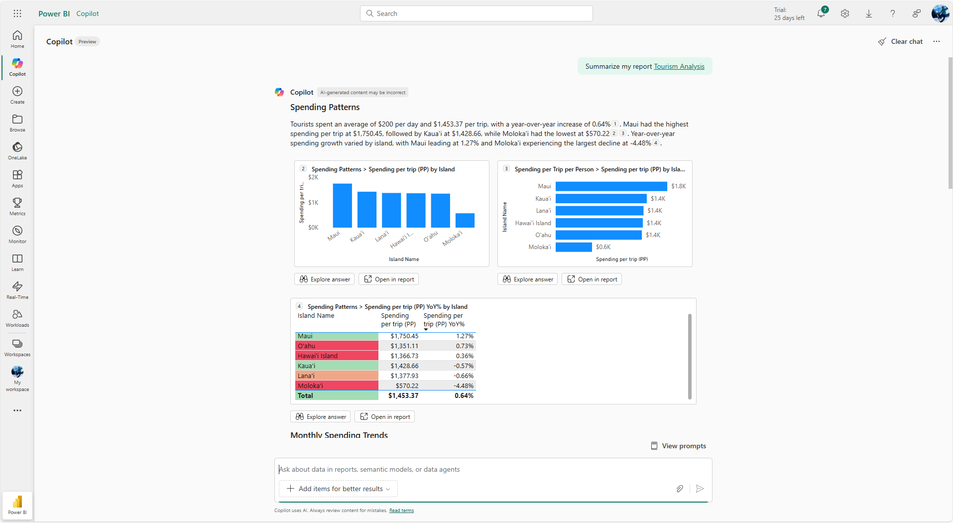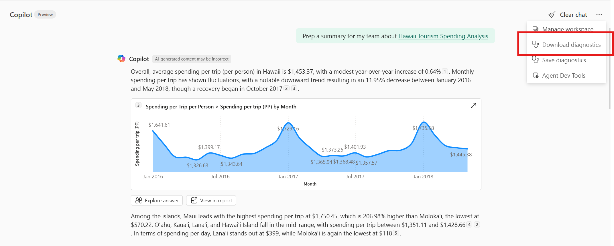You can see based on the description that the summary was filtered, but you can even hover over the filter icon and see that the Maui filter was applied to all the visuals I see in the response. You can click the view in report button in the standalone experience and be taken to the visual being referenced, with the appropriate filters applied. There are some filtering limitations which are noted below.