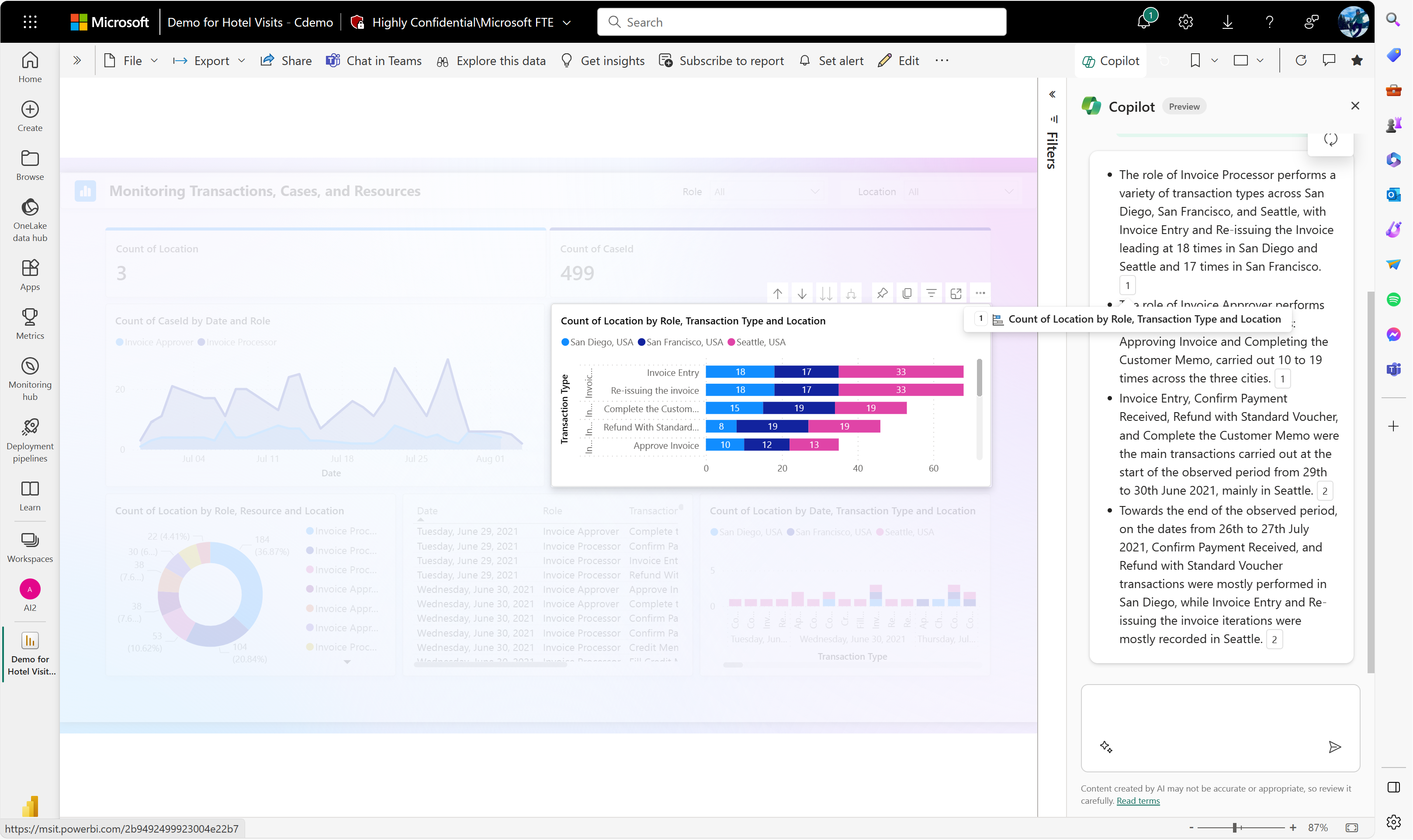 In this immersive experience, you can also dive deeper into the visuals provided to continue your analysis - another key difference from the Copilot pane in the report view. Use the Explore buttons under the visuals to open them in a format that supports deeper exploration, allowing you to slice, dice, and interact with the data more directly.