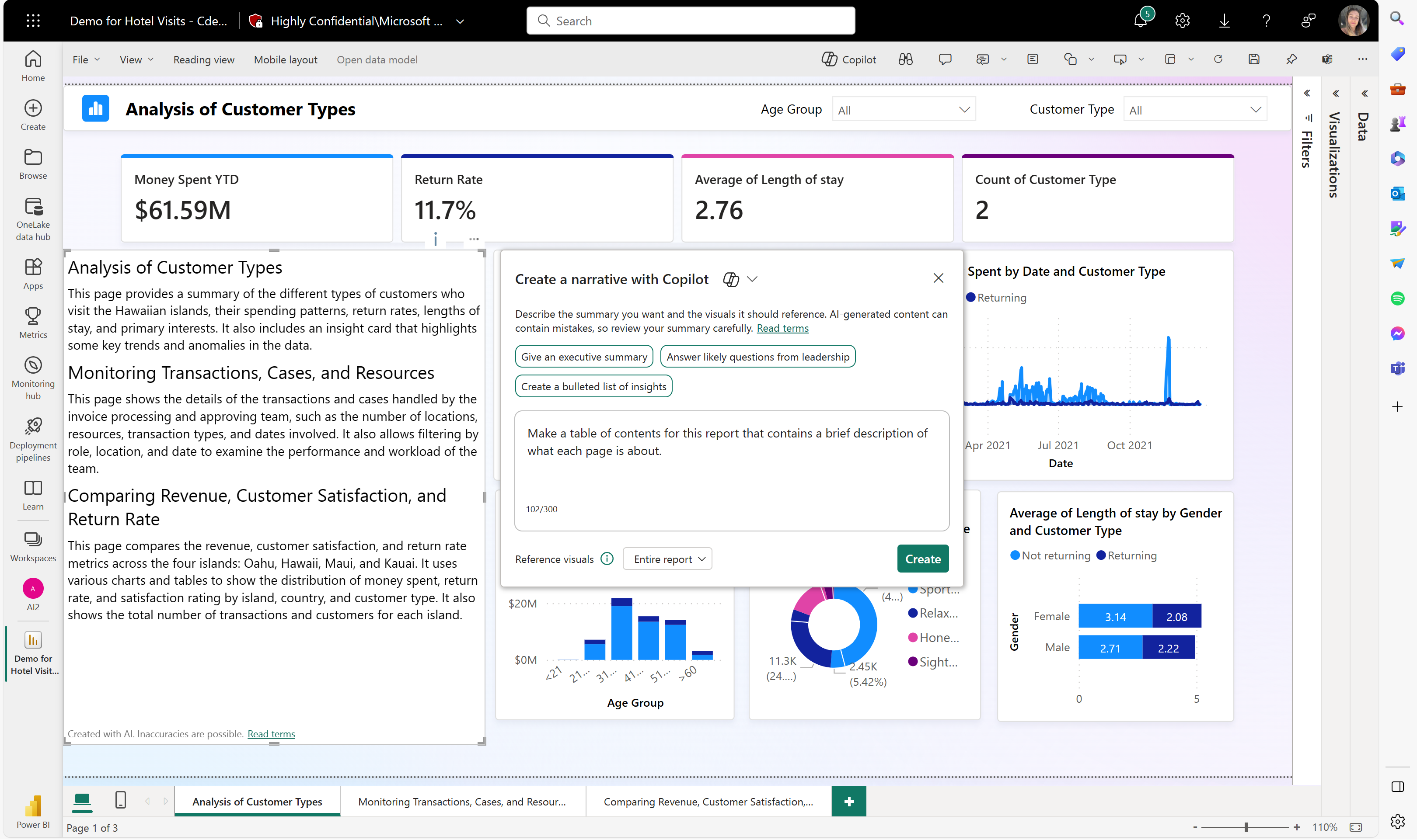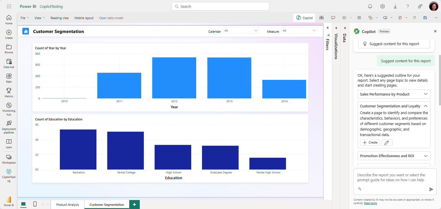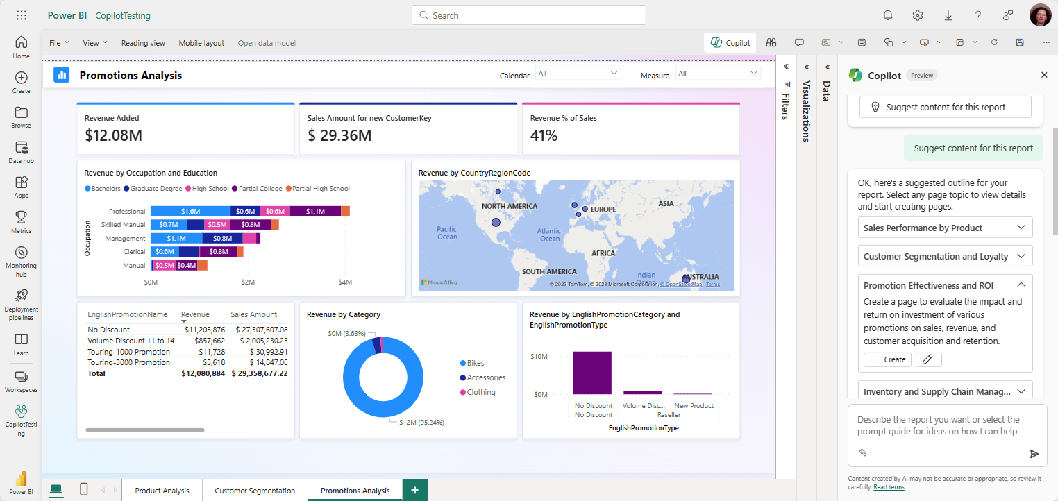 Each sample prompt is paired with a report page that Copilot generated based on the interpretation of that prompt. Your prompts help Copilot understand what you're looking for, but they might not produce a page that's exactly what you want. It's a starting point for report page creation. Use the user interface to modify the report page that Copilot created.