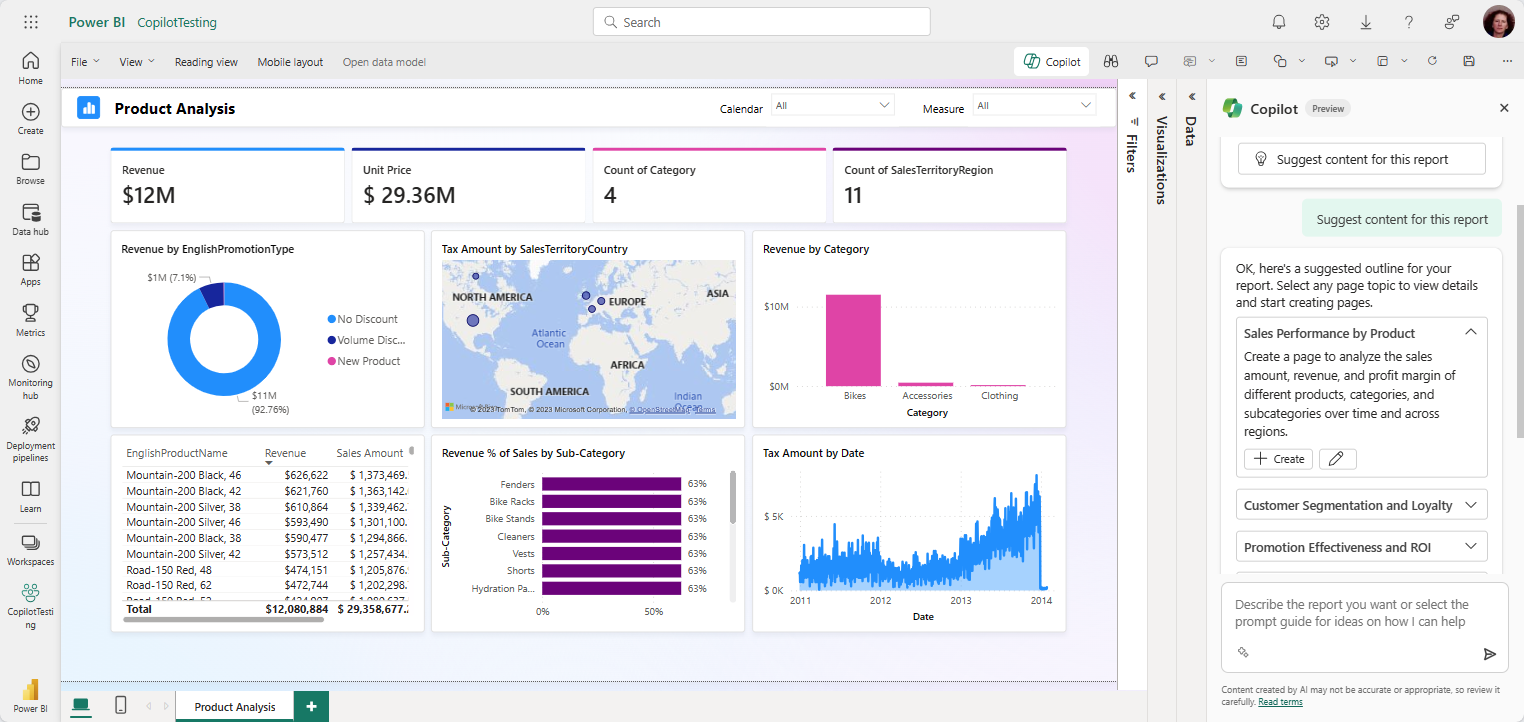 "Create a page to analyze the sales amount, revenue, and profit margin of different products, categories, and subcategories over time and across regions."
