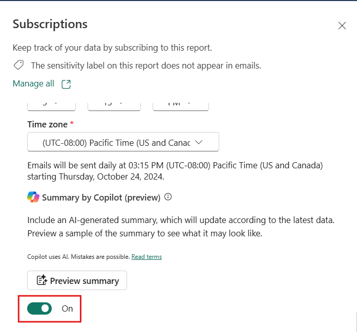 You can include a Copilot generated summary for your Power BI report page or full report attachment in your email subscription to get insights. All the recipients of the email subscription receive the Copilot summary in the email. This feature is currently supported only for Standard Subscriptions.