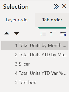 In the Selection pane, selecting Tab order displays the current tab order for your report. You can select an object, then use the up and down arrow buttons to move the object in the hierarchy. You can also select an object with your mouse and drag it to the position you'd like in the list. Clicking on the number next to an object hides the object from the tab order.