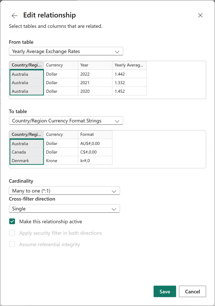 If you have Autodetect for relationships on (on the Column tools tab, select Manage relationships, then select Autodetect), the relationship between Country/Region Currency Format Strings and Yearly Average Exchange Rates on the Country/Region column might have been created for you. If not, then create this relationship by using the New relationship button in Column tools > Manage relationships: