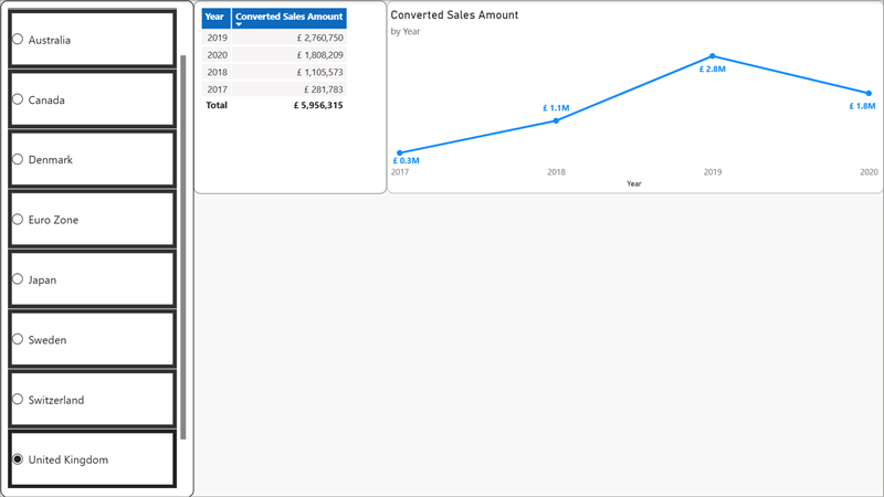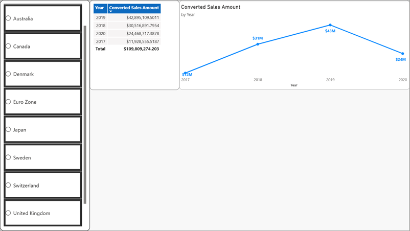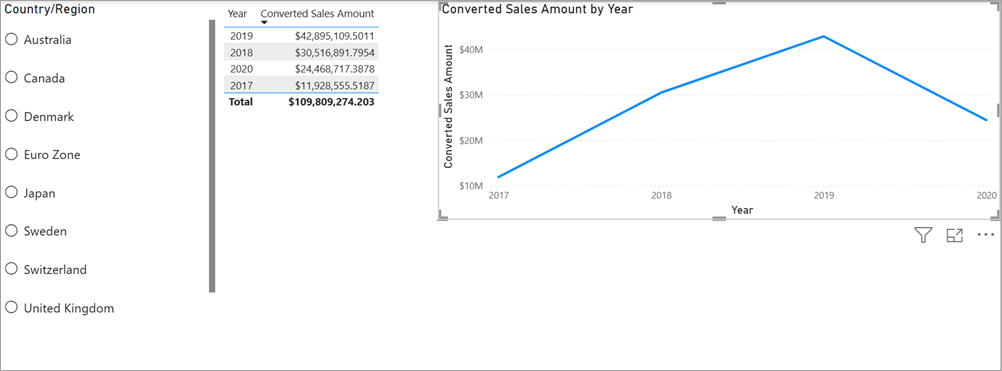 Select a different Country/Region in the slicer. The table and line chart visuals should now show the converted currency amount, in the correct format, for that Country/Region or region. Try selecting a different country/region in the slicer to see how the visuals change.
