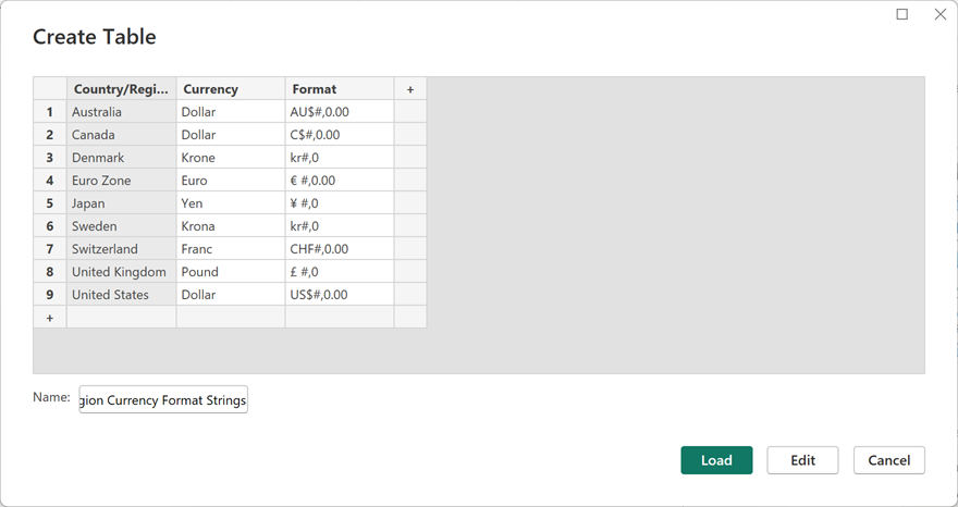 In the Create Table dialog, enter Country/Region Currency Format Strings in the Name field, then copy and paste the following table: