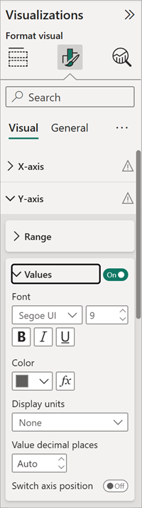 Although not required, you can change visual properties to make a nicer report. Use the Format your visual button in the Visualizations pane to make the following changes: