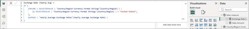 Exchange Rate (Yearly Avg) = IF ( ISBLANK ( SELECTEDVALUE ( 'Country/Region Currency Format Strings'[Country/Region] ) ) || SELECTEDVALUE ( 'Country/Region Currency Format Strings'[Country/Region] ) = "United States", 1, AVERAGE ( 'Yearly Average Exchange Rates'[Yearly Average Exchange Rate] ) )Now, create another measure to convert the Sales Amount measure to other currencies. Right-click Sales measures, select New measure, enter the following expression into the DAX formula bar, and press Enter: