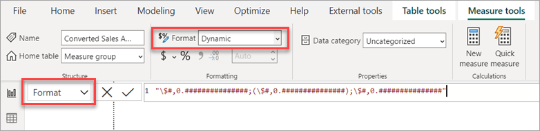 In the Measure tools ribbon > Formatting section > Format listbox, select Dynamic. A new drop-down with Format already selected appears to the left of the DAX formula bar. This drop-down is how you can switch between the static measure DAX expression and the dynamic format string DAX expression. Whatever the static format string was in use before switching to Dynamic is prepopulated as a string in the DAX formula bar.