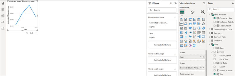 In the Data pane > Sales measures, select Converted Sales Amount. Without selecting anywhere else, also select Year in the Date table.