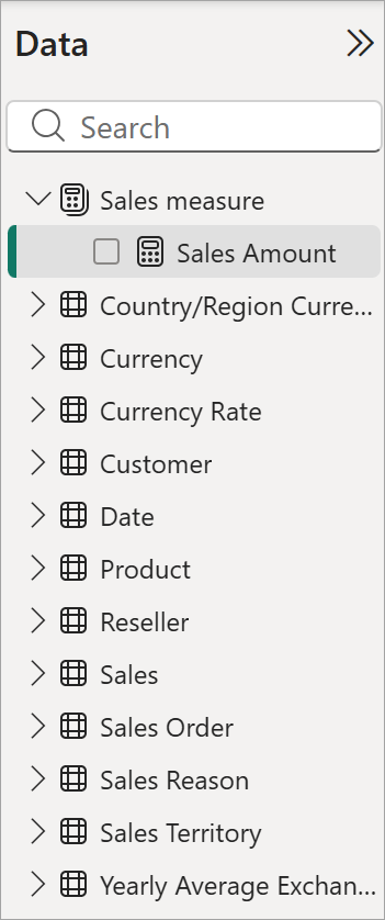 In Sales measures, right-click Column1 and select Hide in report view. This changes Sales measures to a measure group, which now appears at the top of the Data pane with a measure group icon, like this: