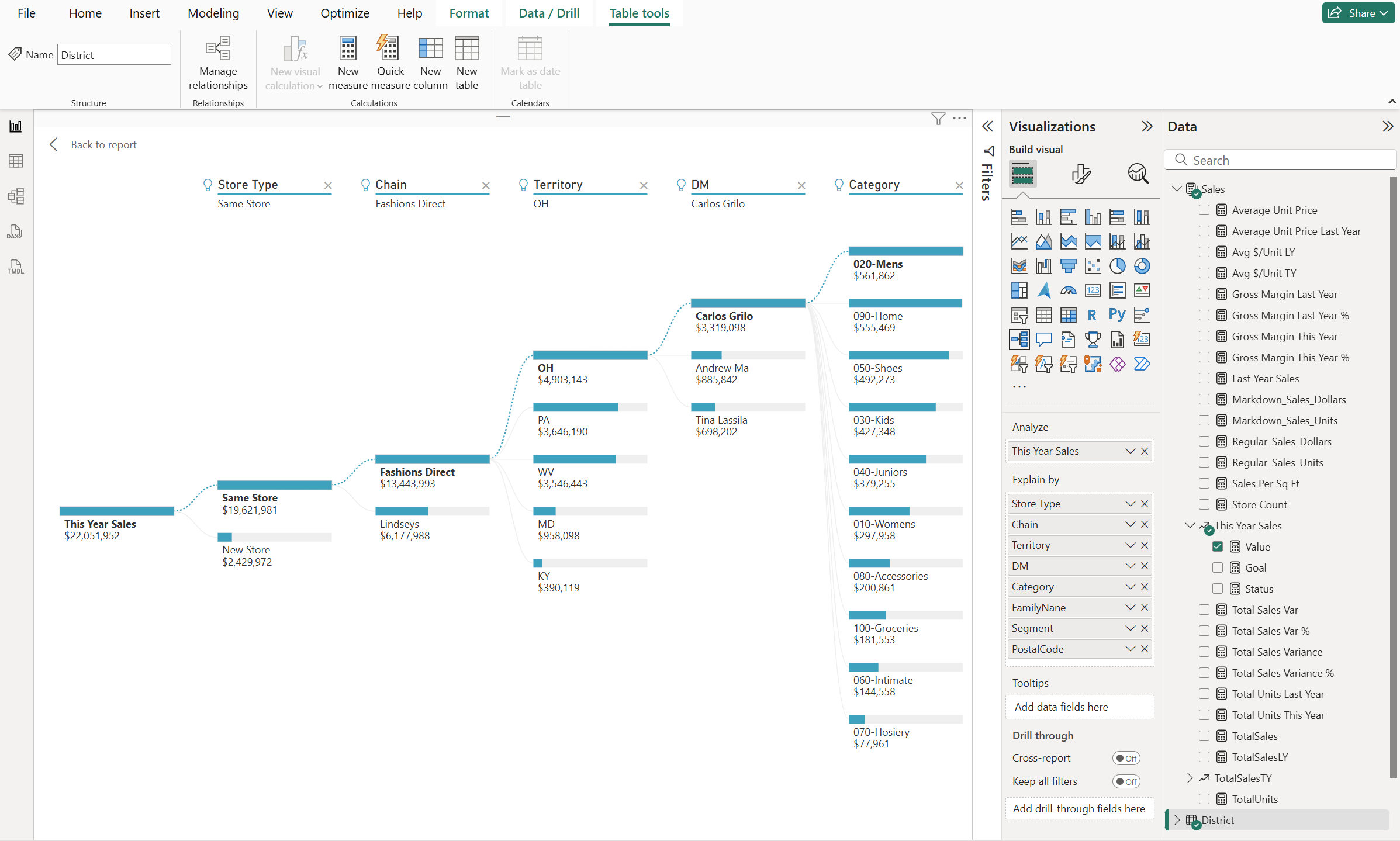 Now anyone who views your report can interact with the decomposition tree, starting from the first This Year Sales and choosing their own path to follow.