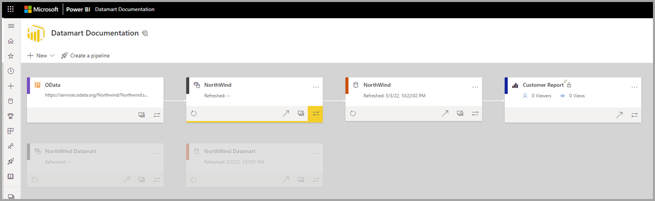 | View lineage | This shows the end-to-end lineage of datamarts from the data sources to the datamart, the auto-generated semantic model, and other semantic models (if any) that were built on top of the datamarts, all the way to deports, dashboards and apps.