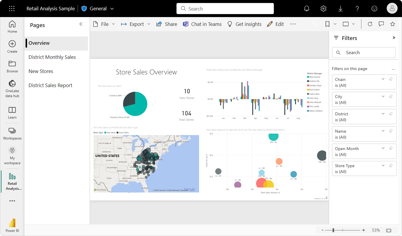 Let's begin by creating a scatter chart that highlights district sales data in the Retail Analysis Sample.