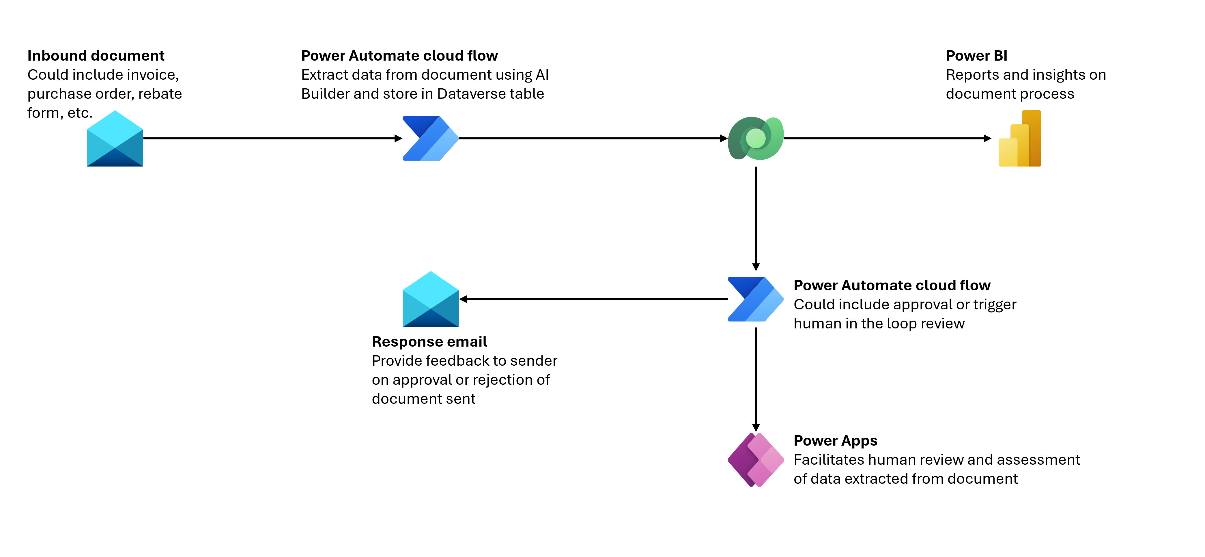 This architecture streamlines and automates document-intensive business processes, using AI Builder to reduce manual data entry, minimize errors, and accelerate decision-making workflows. Use cases include automating invoice processing, purchase order approvals, and rebate form processing.