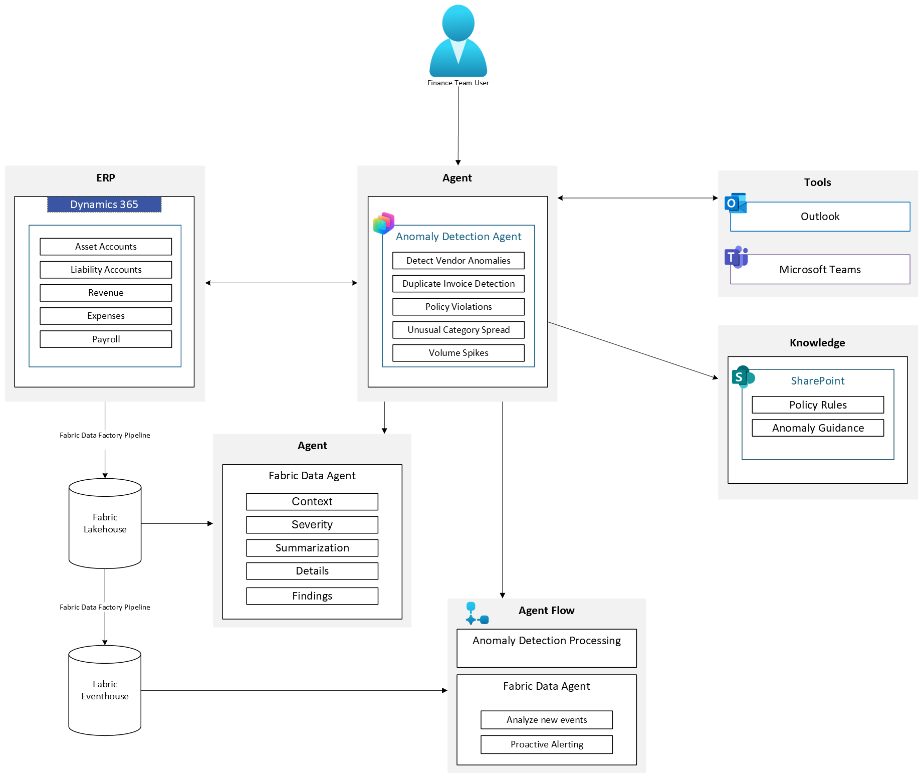 This solution idea shows how the Using AI Agents to build a spend anomaly identification agent scenario from the Microsoft Scenario Library could be architected. Refer to the details in the scenario library to learn more about the business impact and key performance indicators (KPIs).