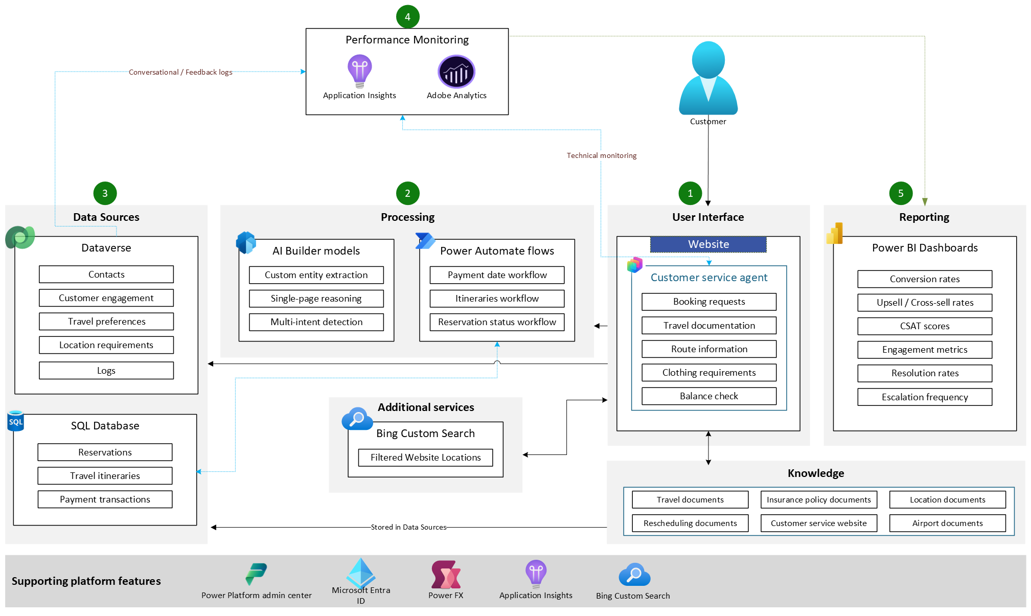 - Platform governance: The Power Platform admin center is used for managing and monitoring components to maintain operational efficiency, with Microsoft Entra ID ensuring secure access to sensitive customer data.