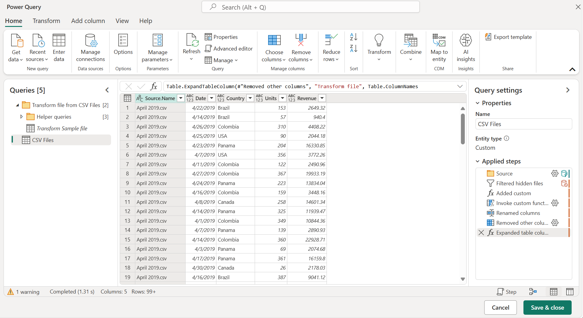 You now need to apply a new set of transformations to clean the data. Each transformation is automatically converted to a function inside the Helper queries group that is applied to every file in the folder before combining the data from each file.