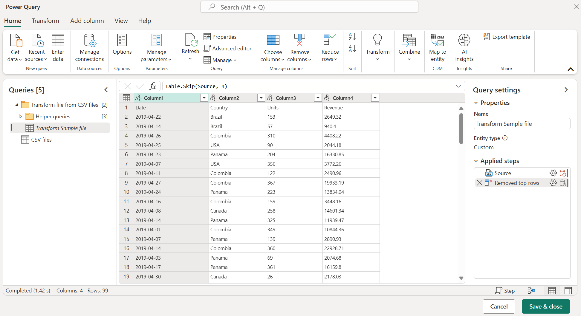 However, the data isn't in the correct shape. You need to remove the top four rows from each file before combining them. To make this change in each file before you combine them, select the Transform Sample file query in the Queries pane on the left side of your screen.