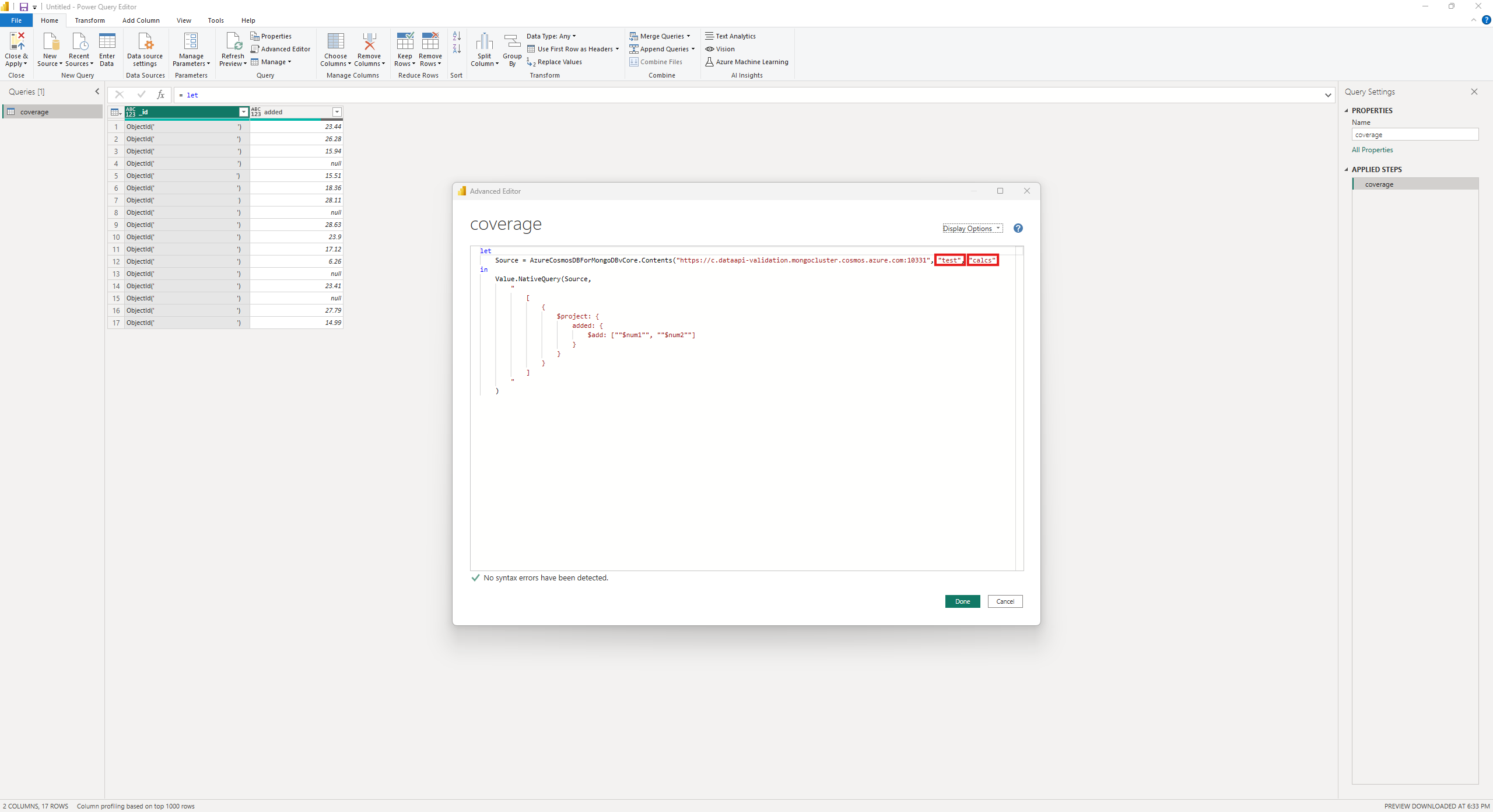 Connect to Azure Cosmos DB for MongoDB vCore database from Power Query Online