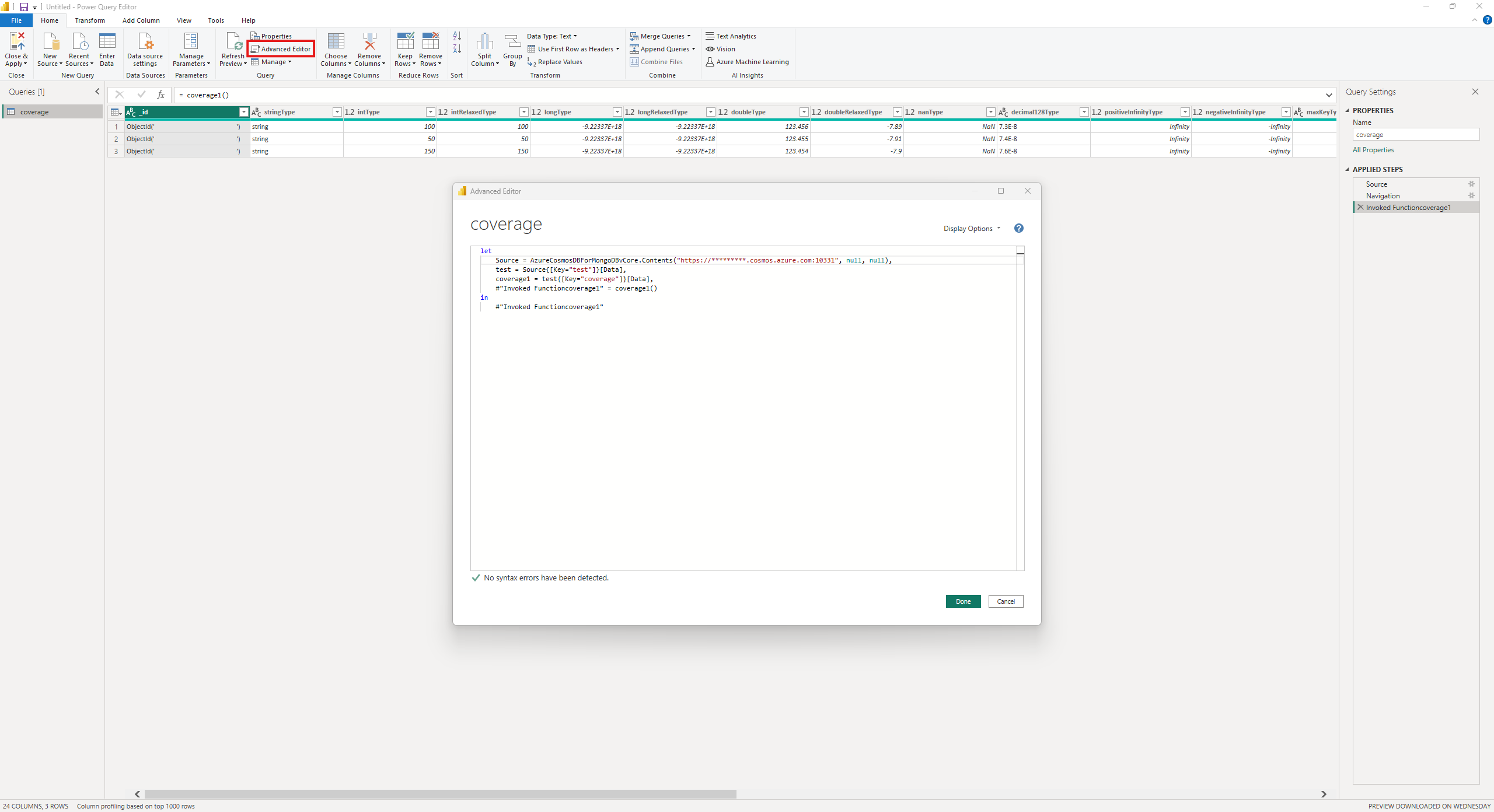 Choose Advanced Editor. The Advanced Editor dialog appears to show the initial query that would be used to fetch all the data in the selected collection.