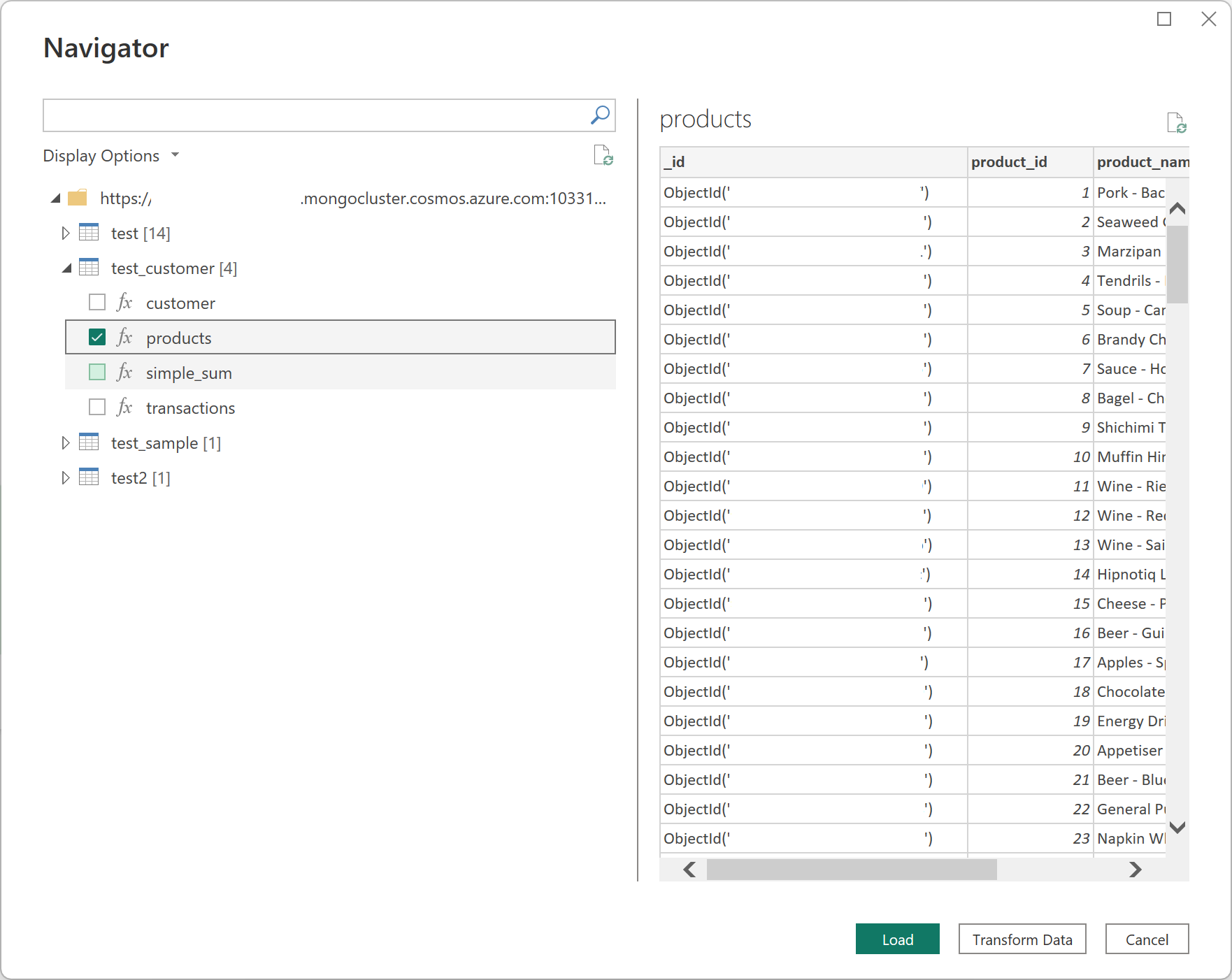 In Navigator, select the database information you want. A list of collections appear under each database. Select one or more collections and then either select Load to load the data or Transform Data to continue transforming the data in Power Query Editor. The list of databases and collections are affected if the optional Database Name and Collection Name were previously supplied.